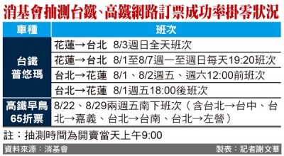 消基會7月中起抽測雙鐵網路訂票平台的訂票情形,結果以台北往花蓮的車票週五訂票成功率最低,只有27%;而花蓮往台北週日的訂票成功率更是「0%」,旅客只能「看的到,買不到」。而高鐵65折早鳥票,週五南下車次也是完全訂不到票。