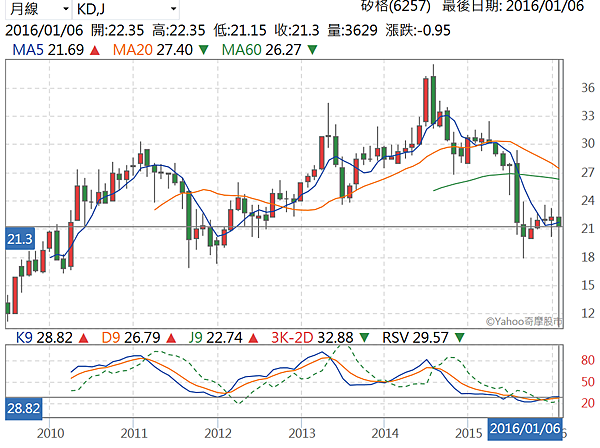 這次以矽格近五年(2010~2015年)的月線圖(KD值指標)來看: