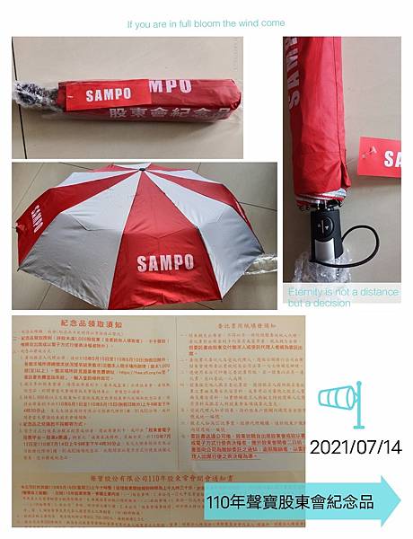 聲寶(1604)110年股東會紀念品是雨傘(自動摺疊)