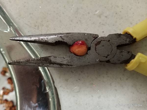 把洗乾淨的櫻桃種子放進尖嘴鉗的圓弧卡槽內,如上圖