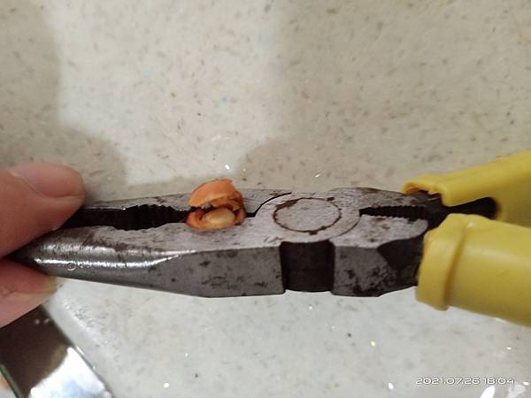 大部分的情況可能外殼只破一半,內核仍無法順利取出(如上圖)